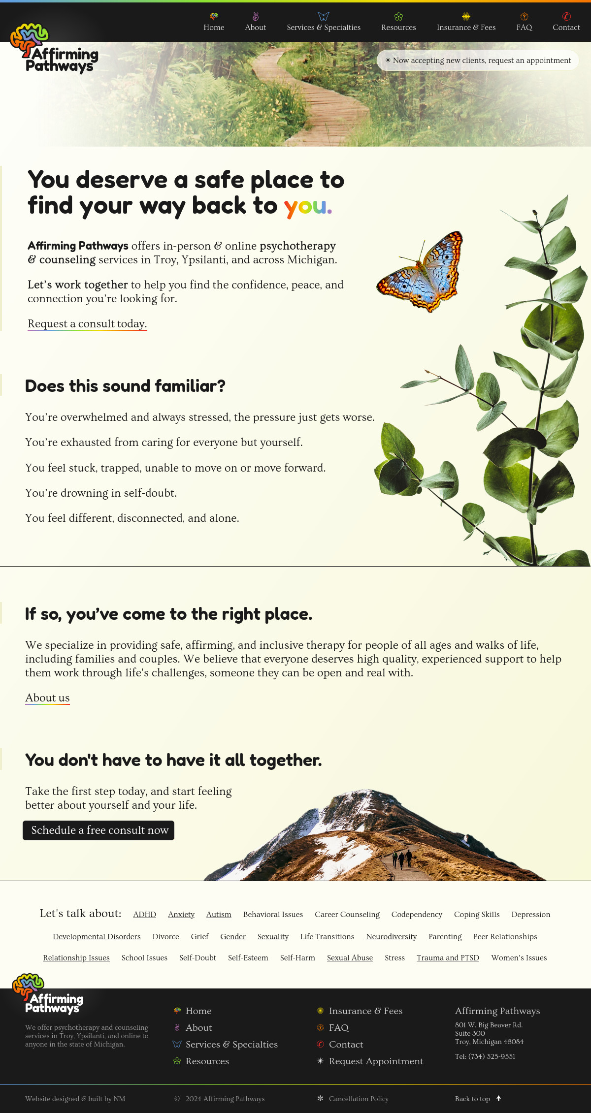 Michigan therapy practice specializing in Neurodiversity- and LGBTQ-affirming, trauma-informed psychotherapy and counseling.